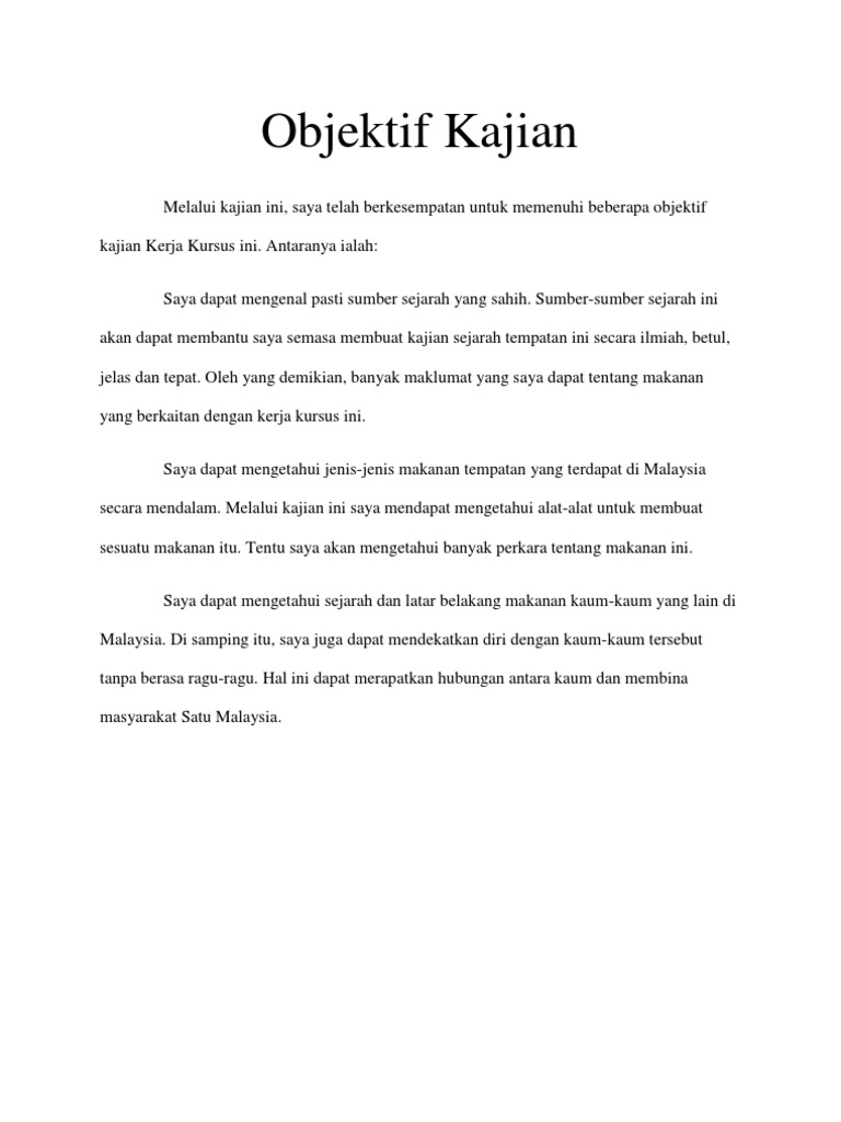 Contoh esei kerja kursus Sejarah STPM Tema Sejarah Tempat Contoh proposal kerja kursus Sejarah STPM Tema Sejarah Tempat ANALISA SOALAN STPM PENGGAL 2 DAN 3. Objektif kajian adalah untuk mengenal pasti jenis-jenis kemudahan yang disediakan di kantin SMJK Yu Hua.